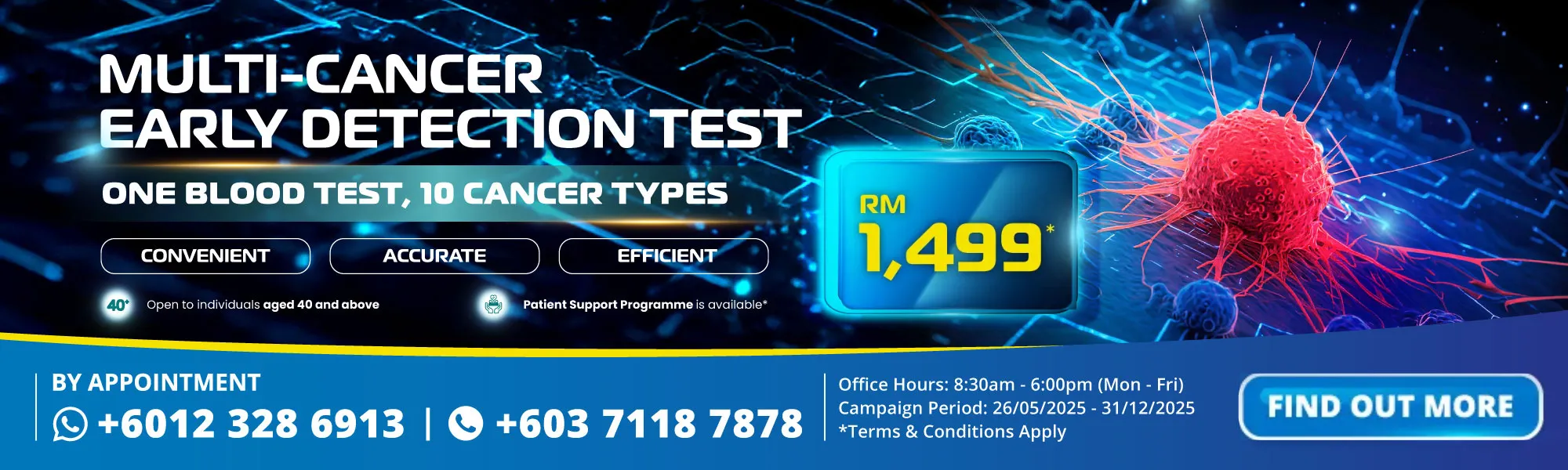Di Beacon Hospital, kami kini menawarkan tes MCED inovatif berbasis ctDNA yang hanya memerlukan sampel darah sebanyak 10 mL untuk skrining kanker secara menyeluruh.