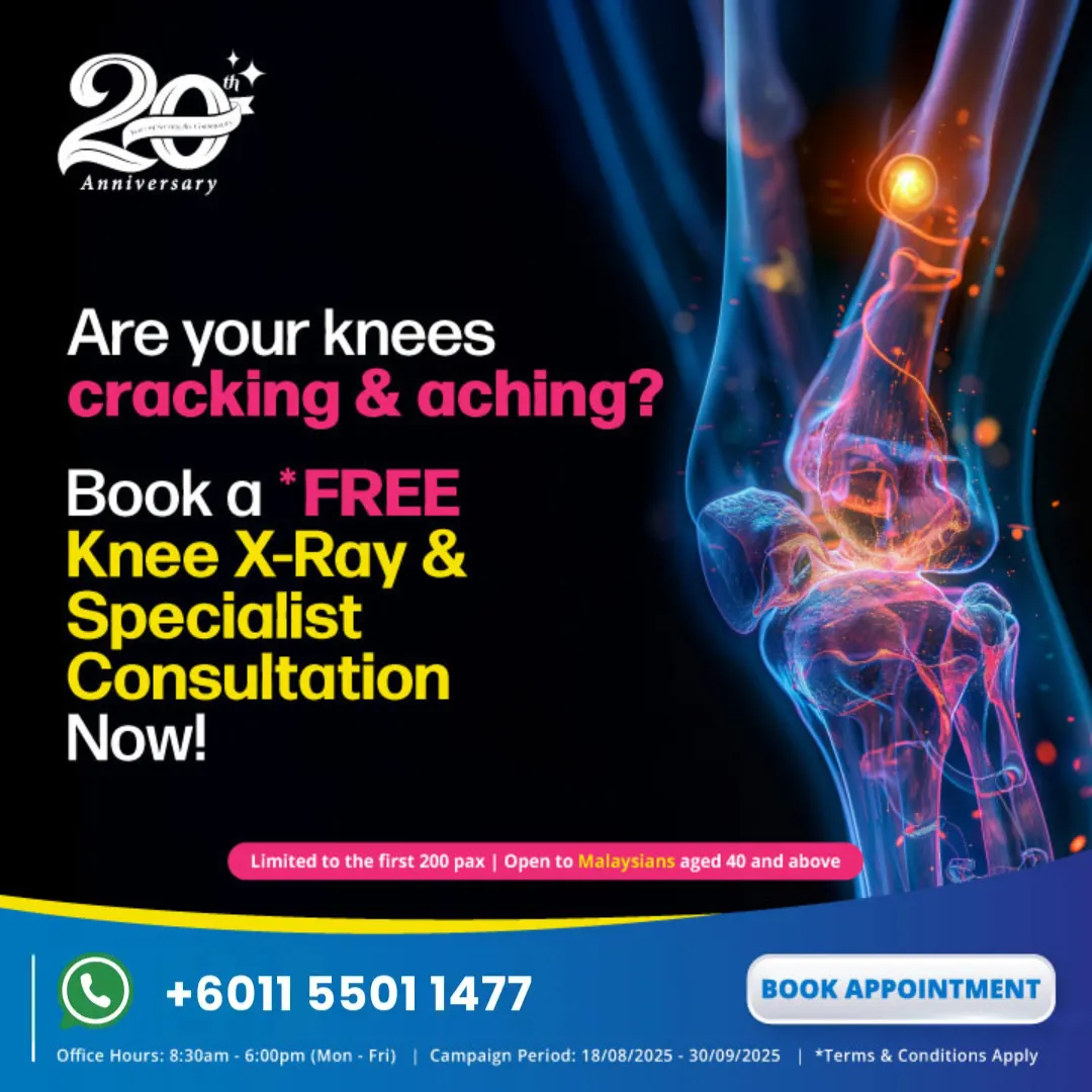 Don't wait until your symptoms worsen. Early diagnosis and intervention can help you stay active, mobile and pain-free. Limited slots available so book your free knee X-ray appointment today!