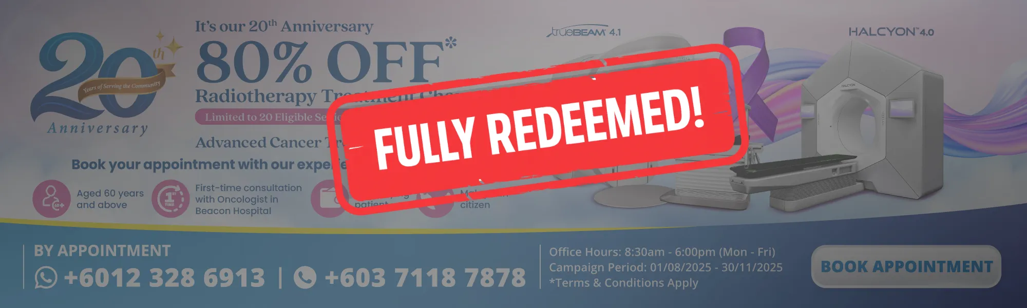 2. Eligible patients will receive 80% off radiotherapy treatment fraction charges for Truebeam/ Halcyon only.